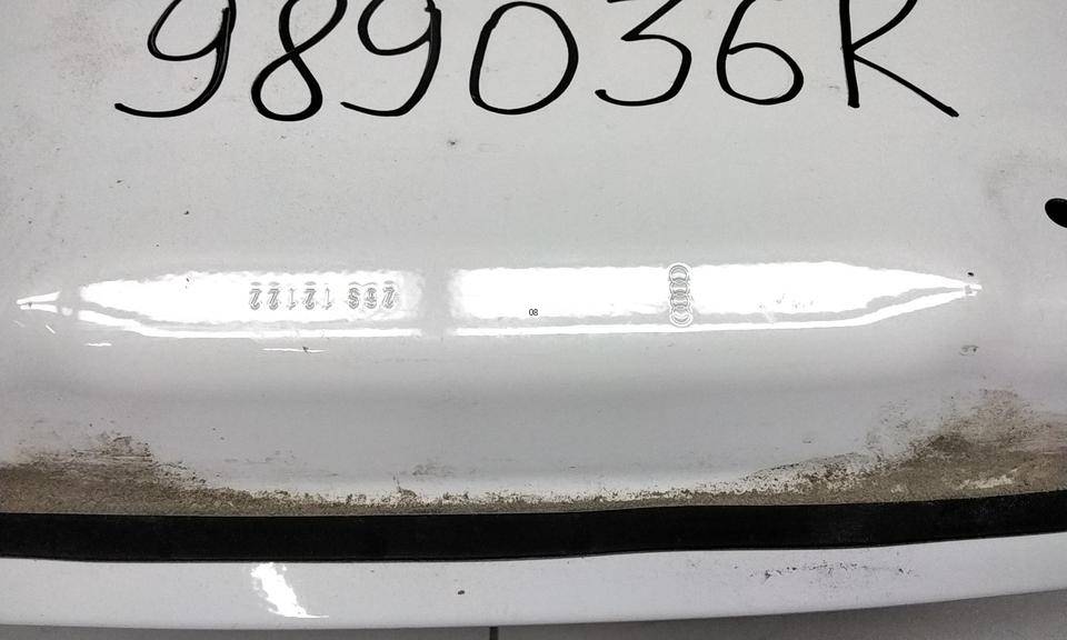 Состояние детали удовлетворительное. Белого цвета, потёртости. Вмятина, разрыв металла, разрыв герметика с правой стороны снизу под фонарем, небольшая деформация на внутренней стороне в этом же месте. Потребуется ремонт и покраска Крышка багажника для Audi E-tron (GEB/GEN) 2018 >