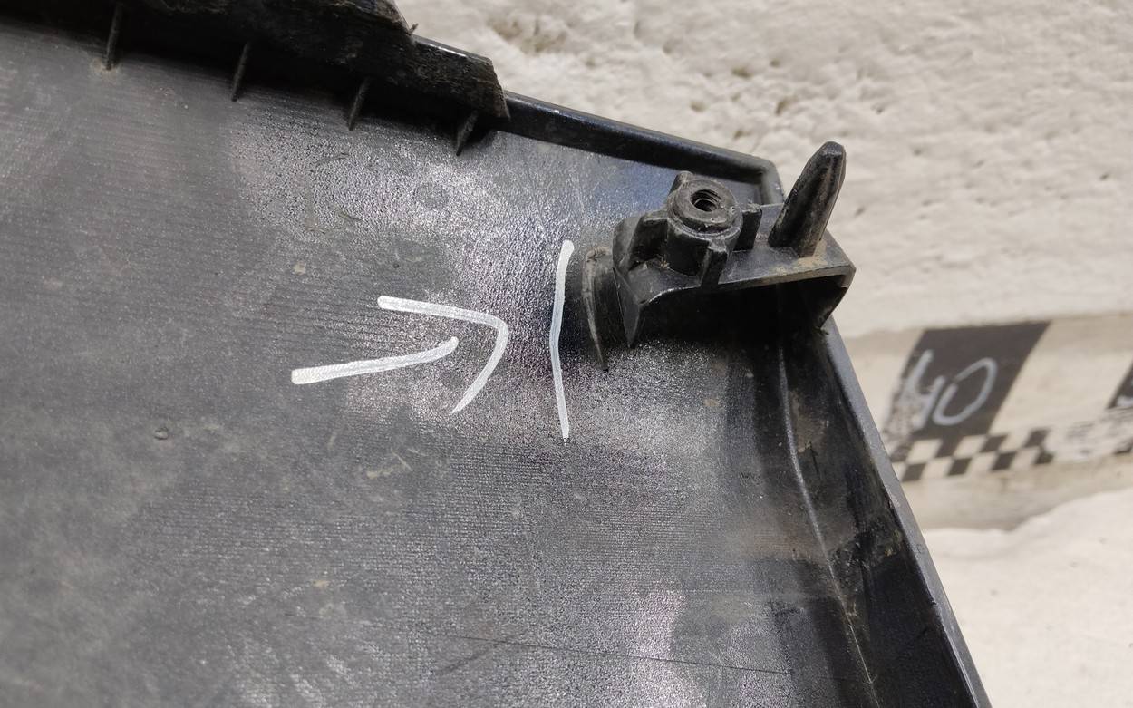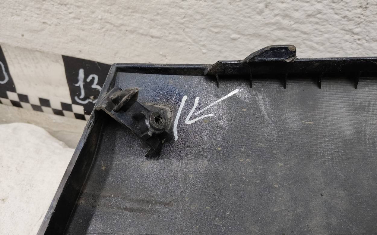 Состояние детали хорошее. Чёрного цвета царапинки. Небольшой дефект пластика по верхней кромке слева. Отсутствуют три крепления под верхнюю решетку и одно под накладку. Одно верхнее левое крепление лопнуло. Потребуется незначительный ремонт