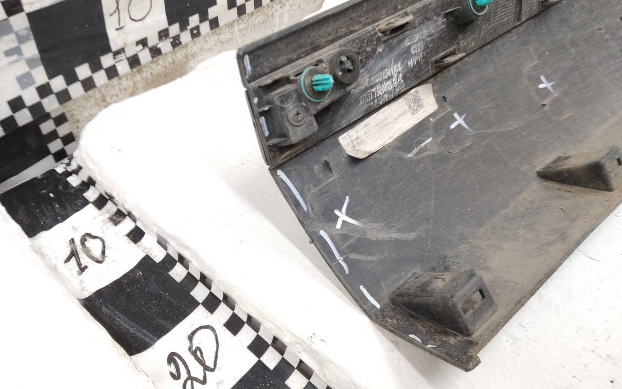 Состояние детали плохое. Отсутствует фрагмент пластика на торце и девять креплений, одно впаяно. Трещина. Молдинг в плёнке. Потребуется ремонт