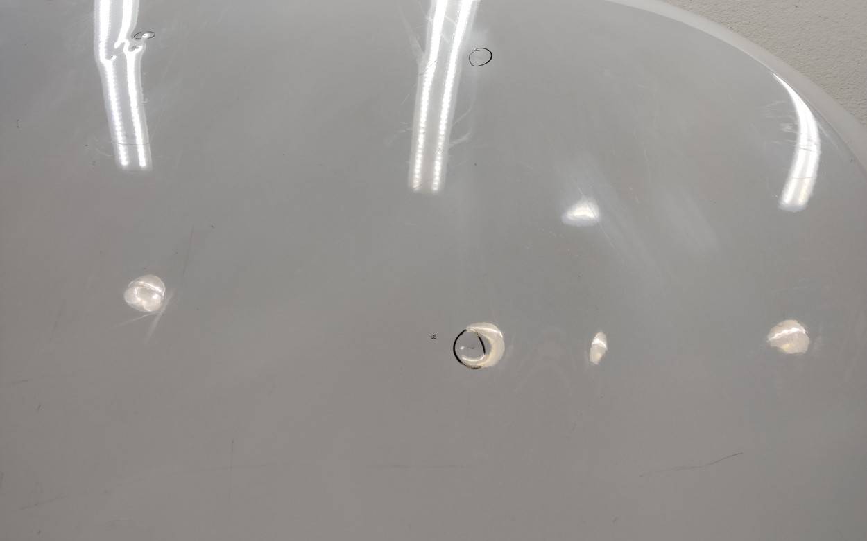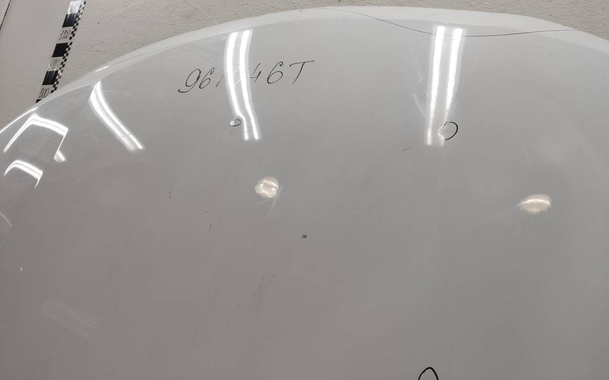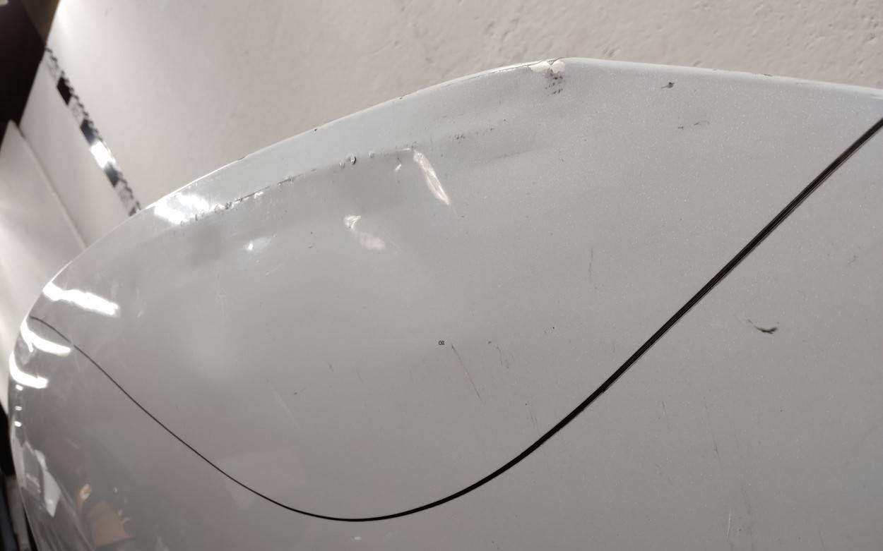 Состояние детали хорошее. Белого цвета, скол ЛКП. Вмятина в передней части, тычки, дефект на внутренней поверхности. Потребуется ремонт