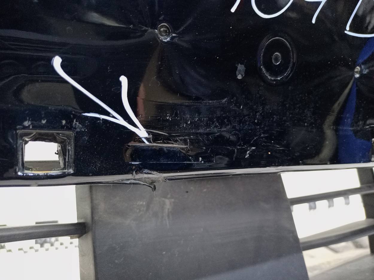 Состояние детали хорошее. Зелёного цвета с юбкой под парктроники. Вмятинки, дефект пластика. Трещина на текстуре. Отсутствуют два крепления на накладке. Потребуется незначительный ремонт