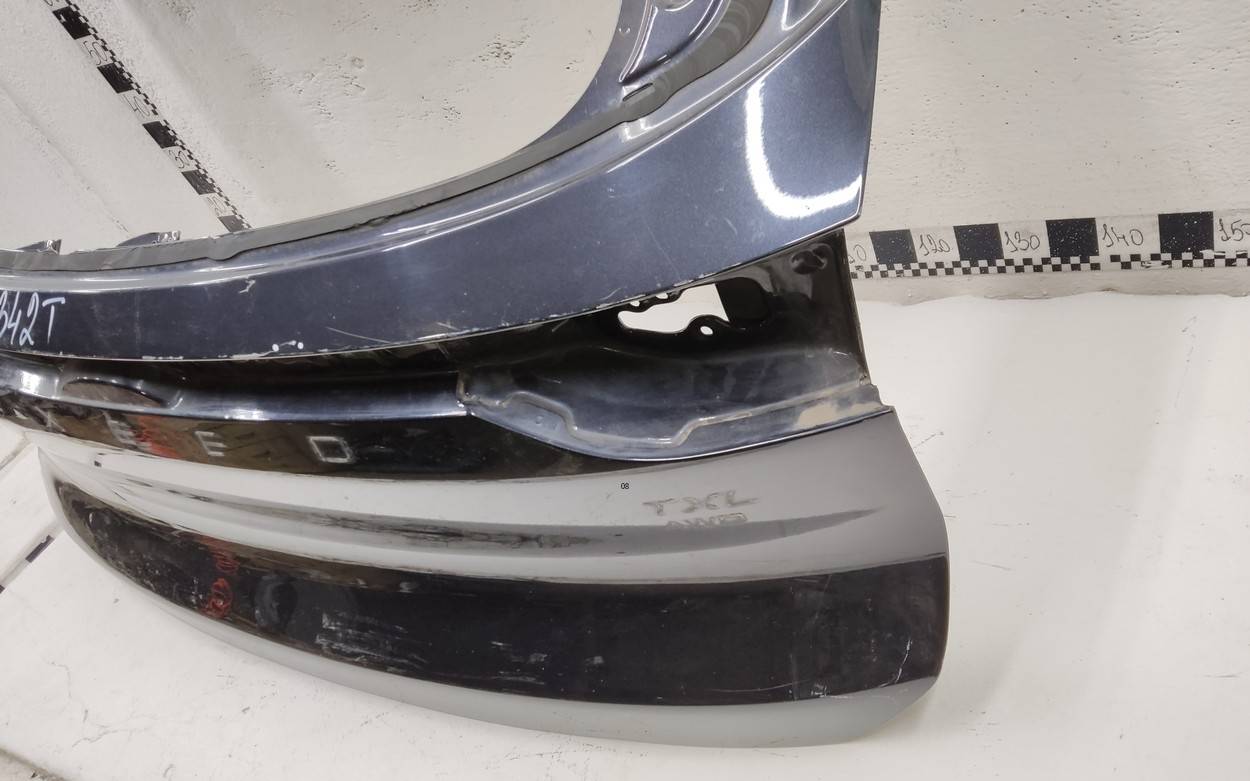 Состояние детали удовлетворительное. Серого цвета, потертости, царапинки. Деформация и трещина пластика у площадки под номер, сломано два крепления решетки слева и справа и одно юбки справа, основные крепления целые. Потребуется ремонт и покраска
