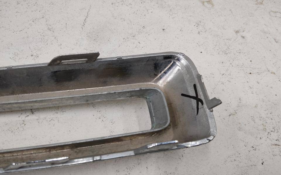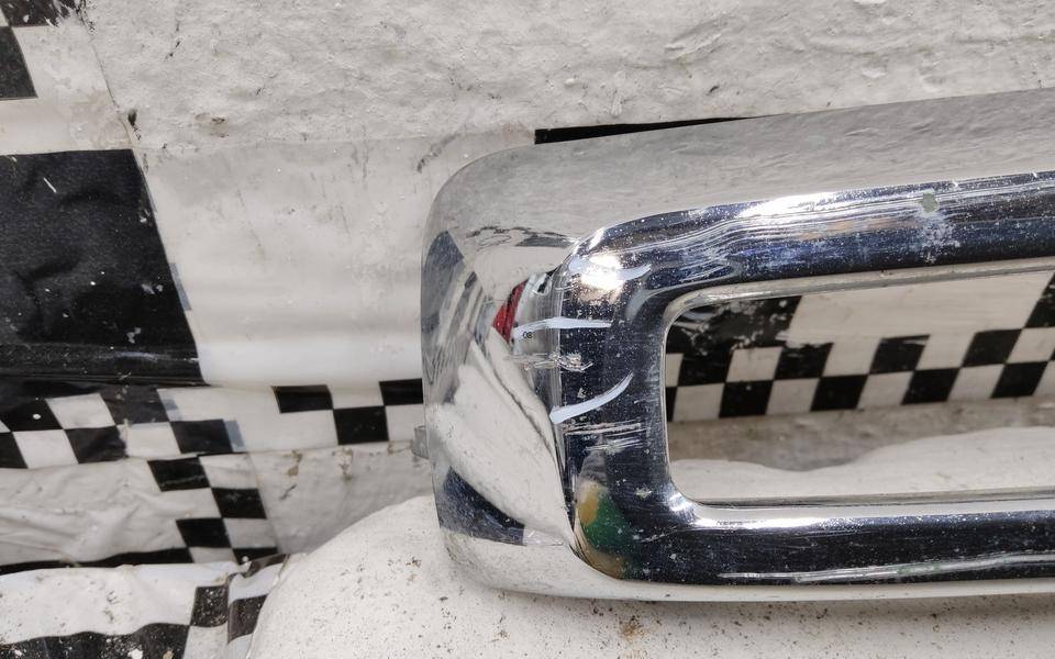 Состояние детали удовлетворительное. Следы эксплуатации, потёртости. Отсутствует фрагмент пластика с крепежным кронштейном и хрома с левой стороны. Потребуется ремонт