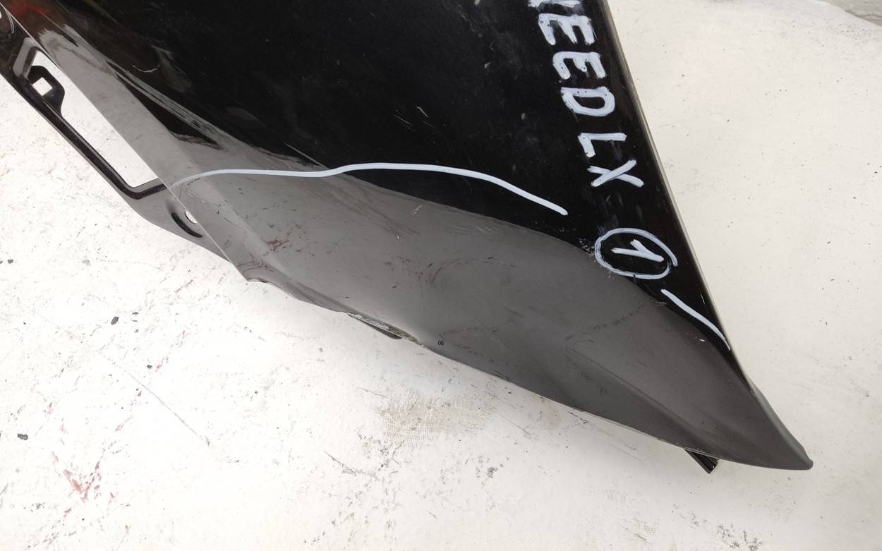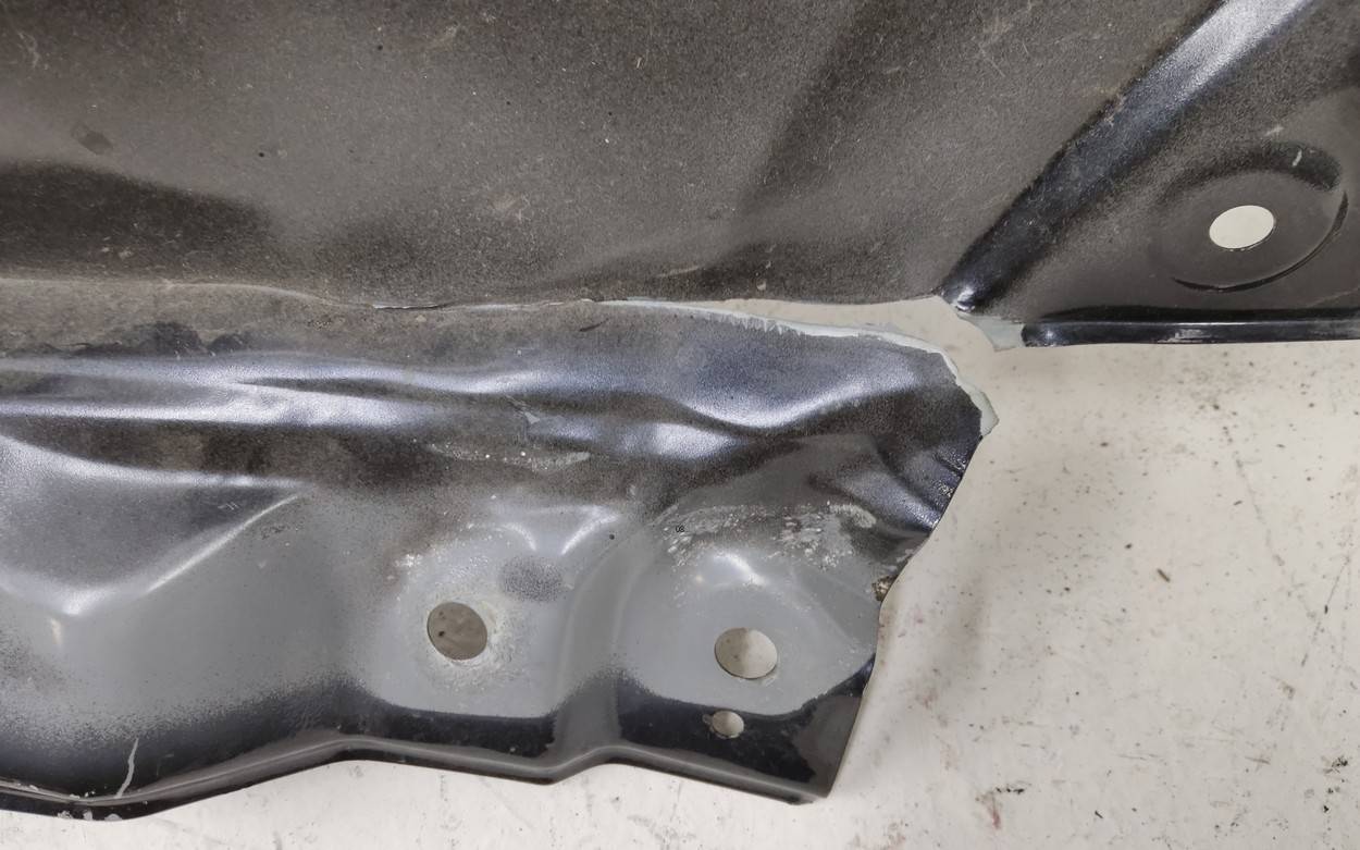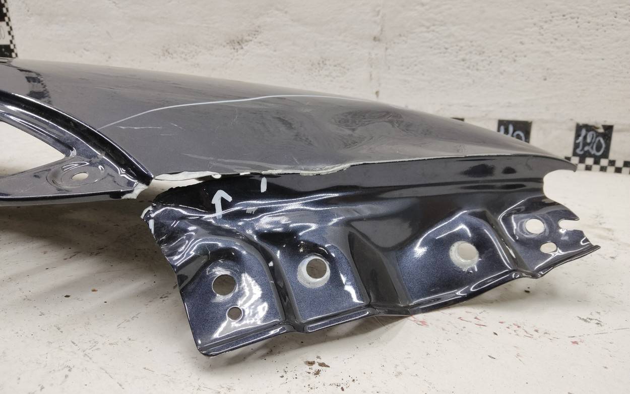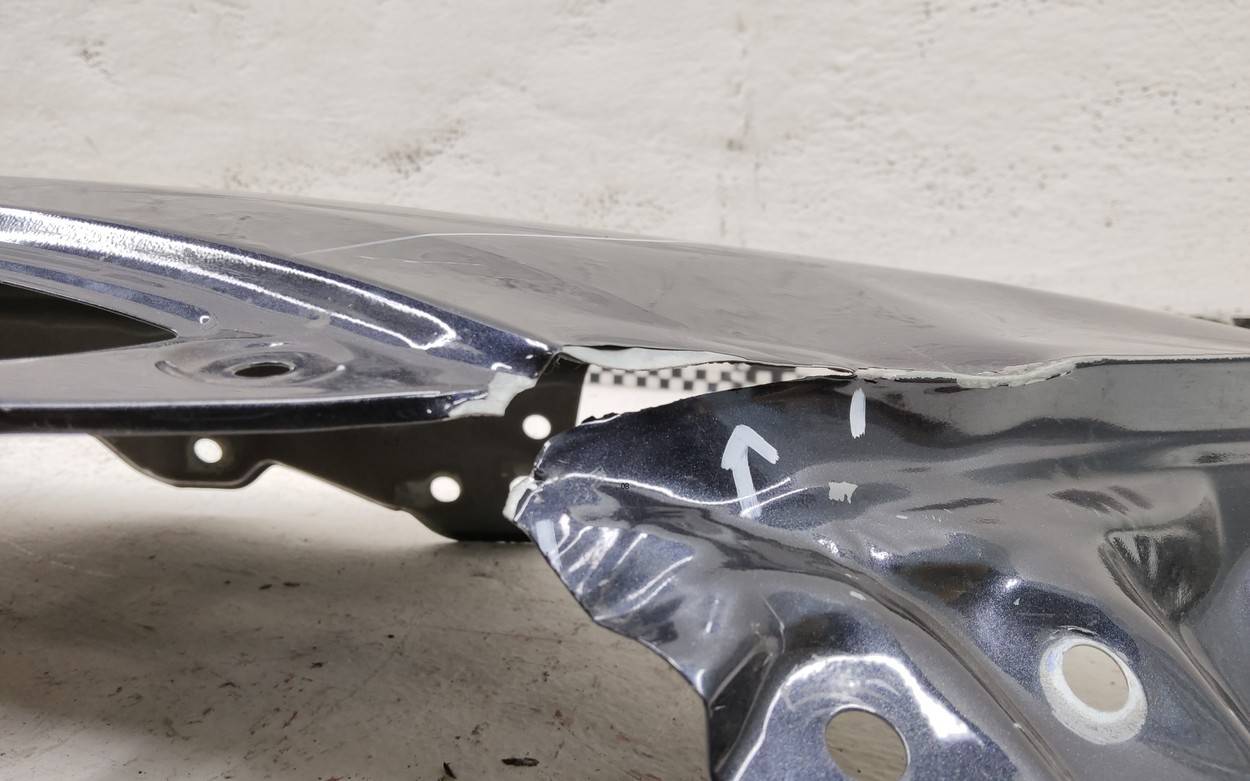 Состояние детали удовлетворительное. Голубого цвета, потертости, царапины. Притертость с вмятиной на плоскости и ребре в передней части, небольшая вмятинка на внутреннем каркасе. Потребуется ремонт и покраска