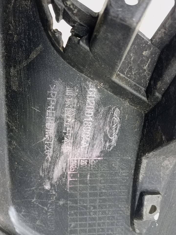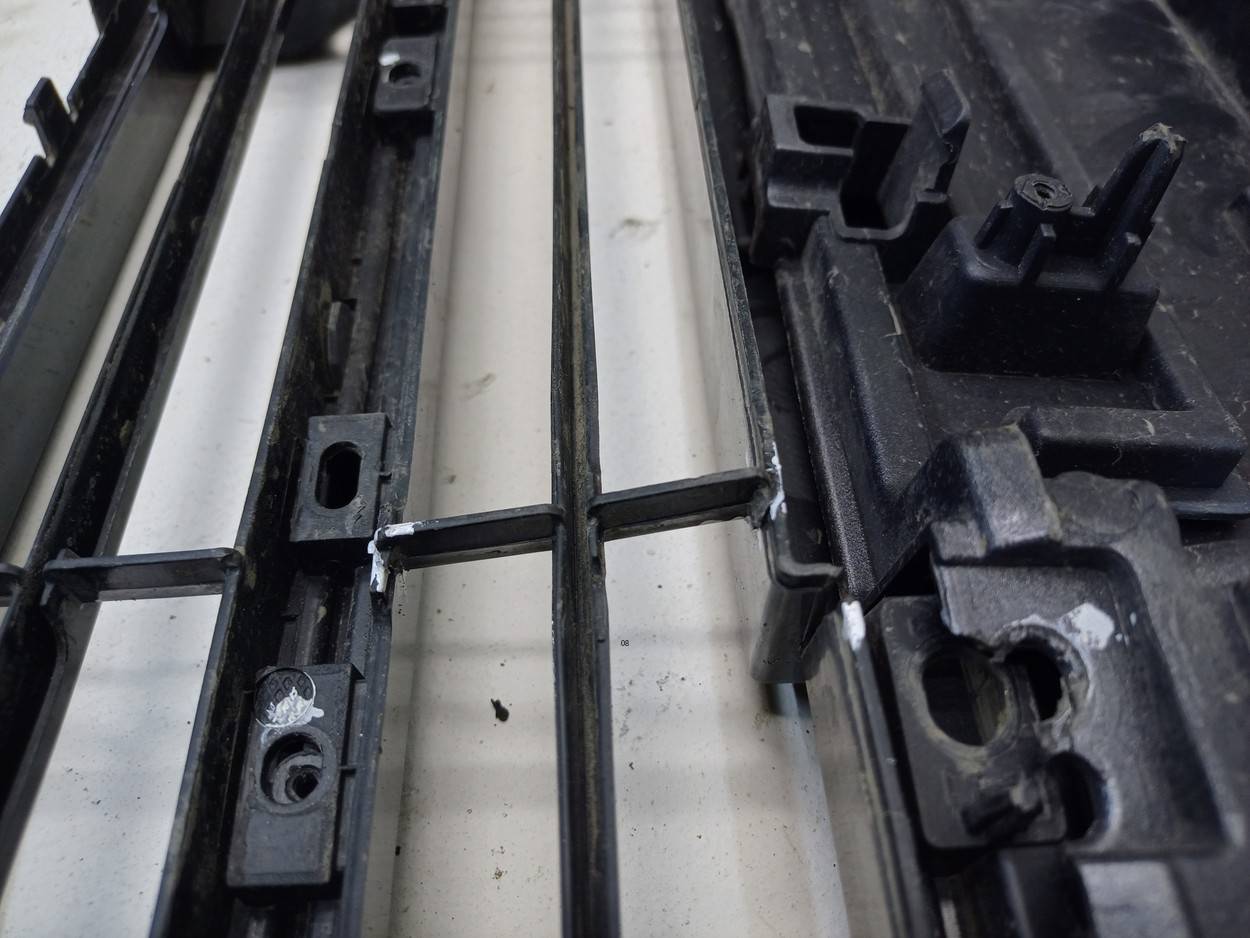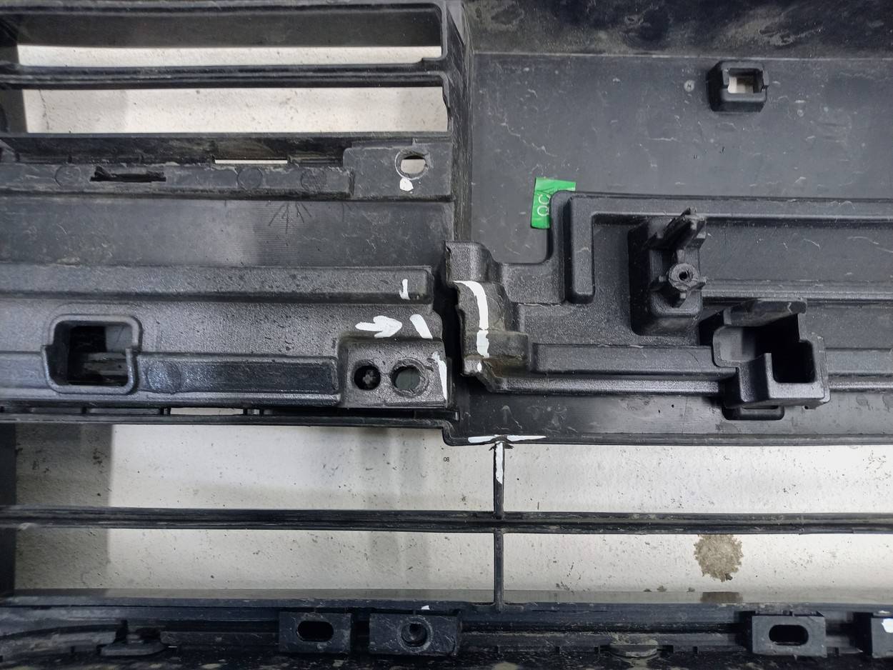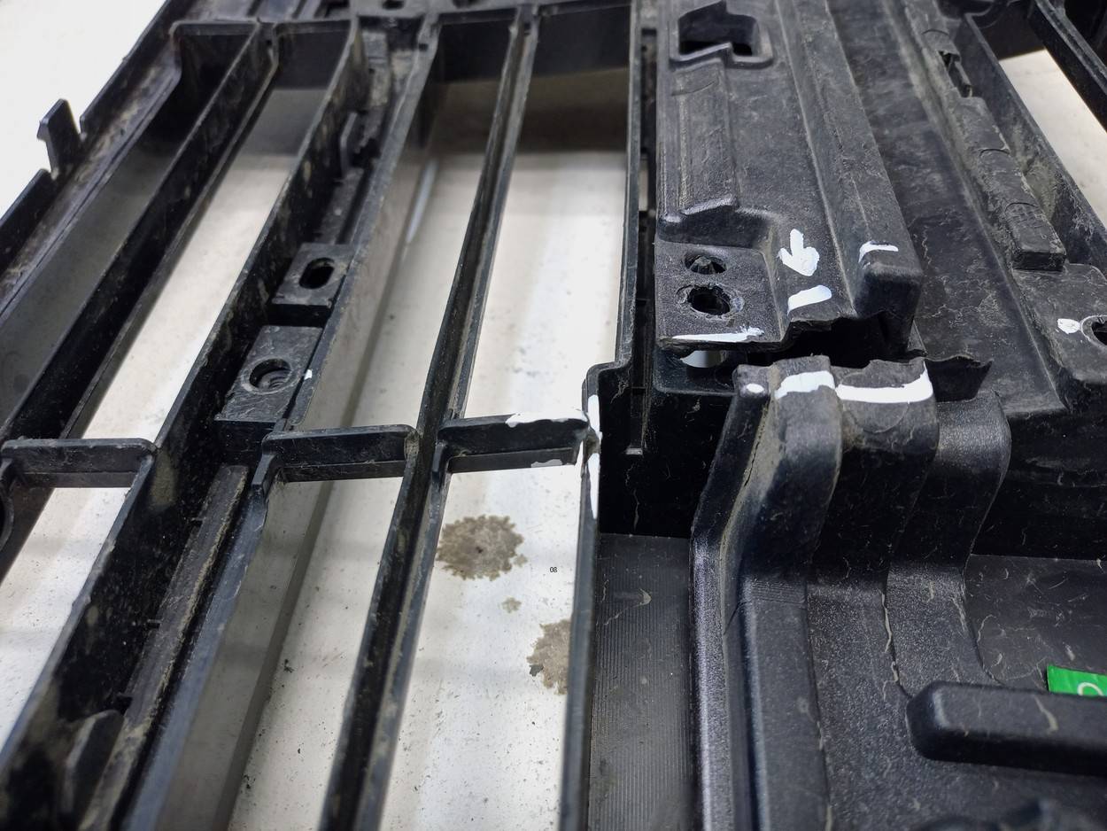 Состояние детали удовлетворительное. Серебристого цвета, потертости, царапины. Нештатные отверстия от установки дополнительной сетки, крепления целые, небольшая трещинка и деформация пластика. Потребуется ремонт и покраска
