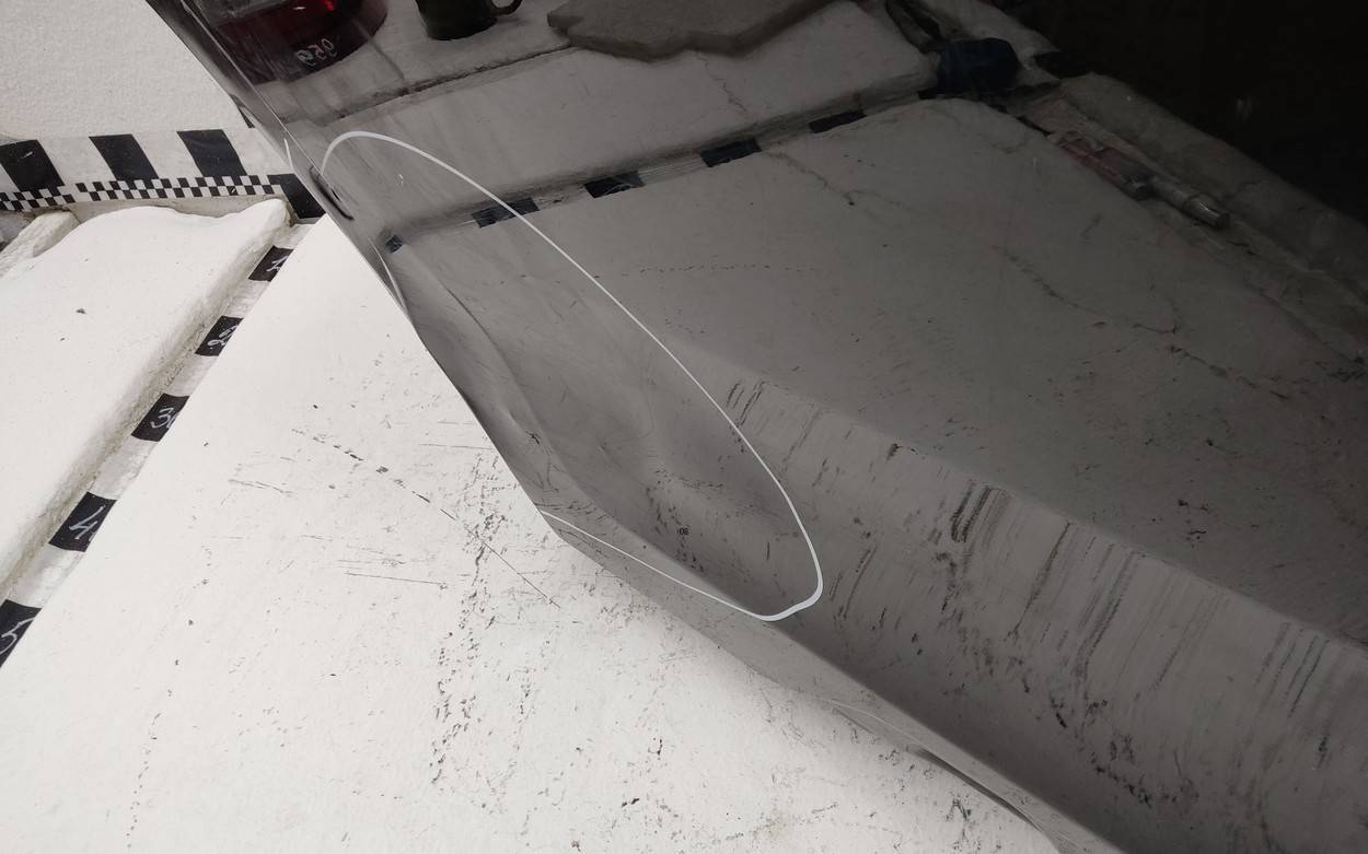 Состояние детали хорошее. Цвет серый. Следы эксплуатации, потертости и царапины. Вмятины, загибы, выпуклости.. Три вмятины в верхней левой части, две выпуклости центральный левой части, одна вмятина в центральной левой части. Загиб в нижнем левом углу, загиб в верхний правой части арки стекла.. Потребуется ремонт
