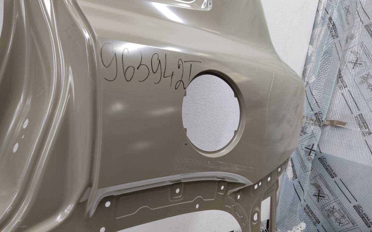 Состояние детали хорошее. Следы эксплуатации, потертости и царапинки текстуры. Повреждение текстуры. Вмятина. Все крепления целые. Бампер в сборе. Решетка бампера 2803107XKN52A. Накладка птф передняя левая 2803124XKN52A.. Вмятина в центральной нижней части. Повреждение текстуры с левой стороны.. Потребуется ремонт