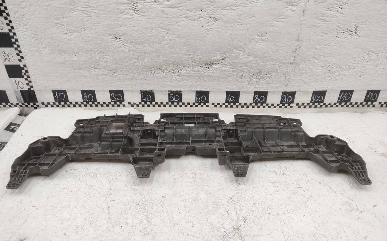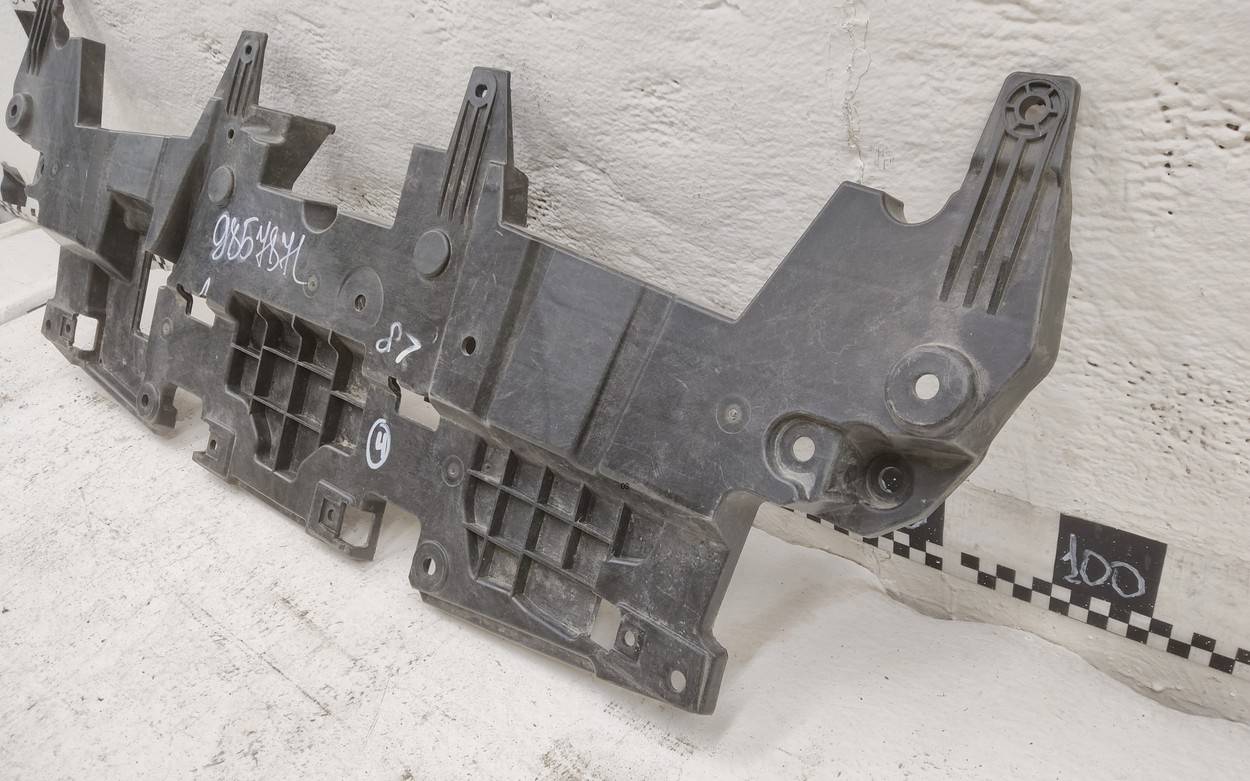 Состояние детали хорошее. Бампер чёрного цвета, следы эксплуатации, бампер в сборе с юбкой, центральной накладкой, с левой накладкой. Царапины потёртости, деформация на центральной полке, разрыв юбки в центральной части, разрыв бампера с правой стороны, дефект одного крепления. Требуется ремонт бампера юбки, ремонт крепления