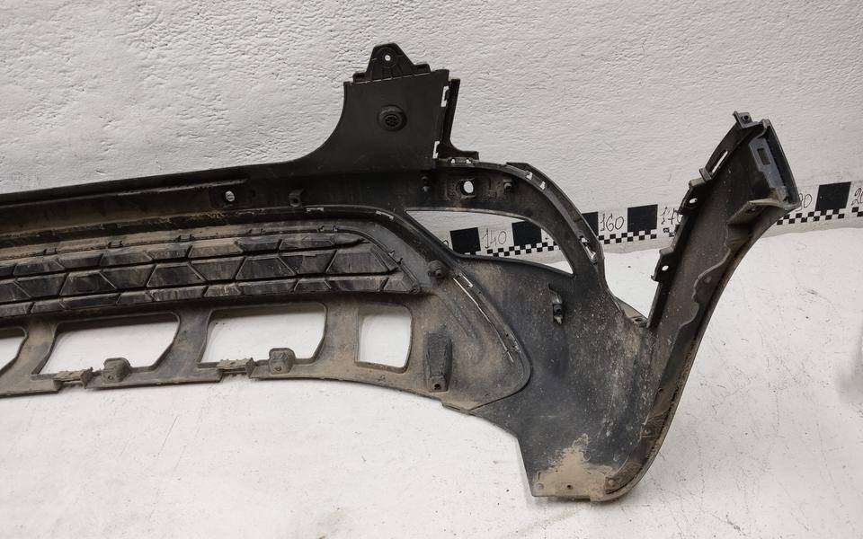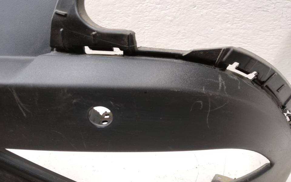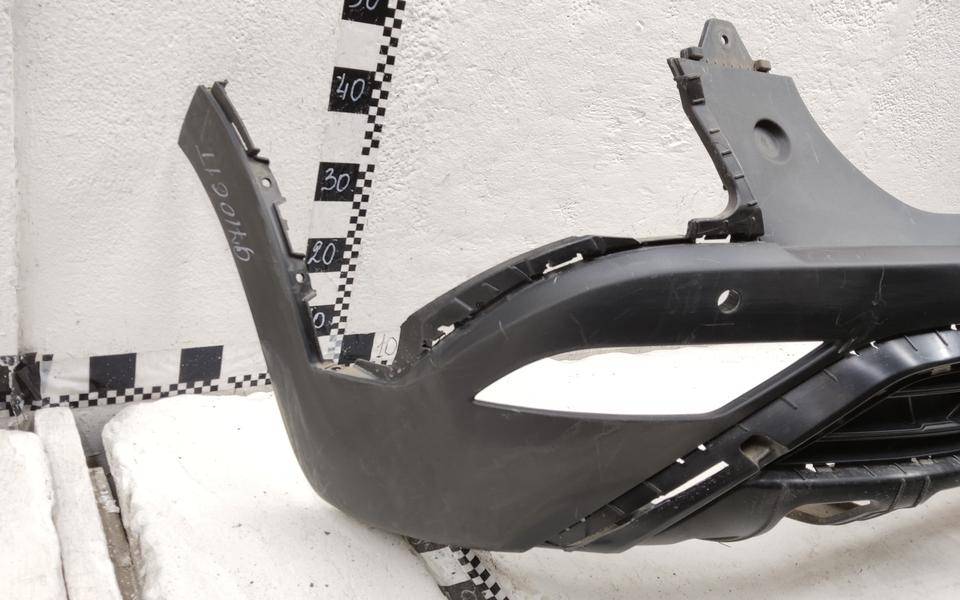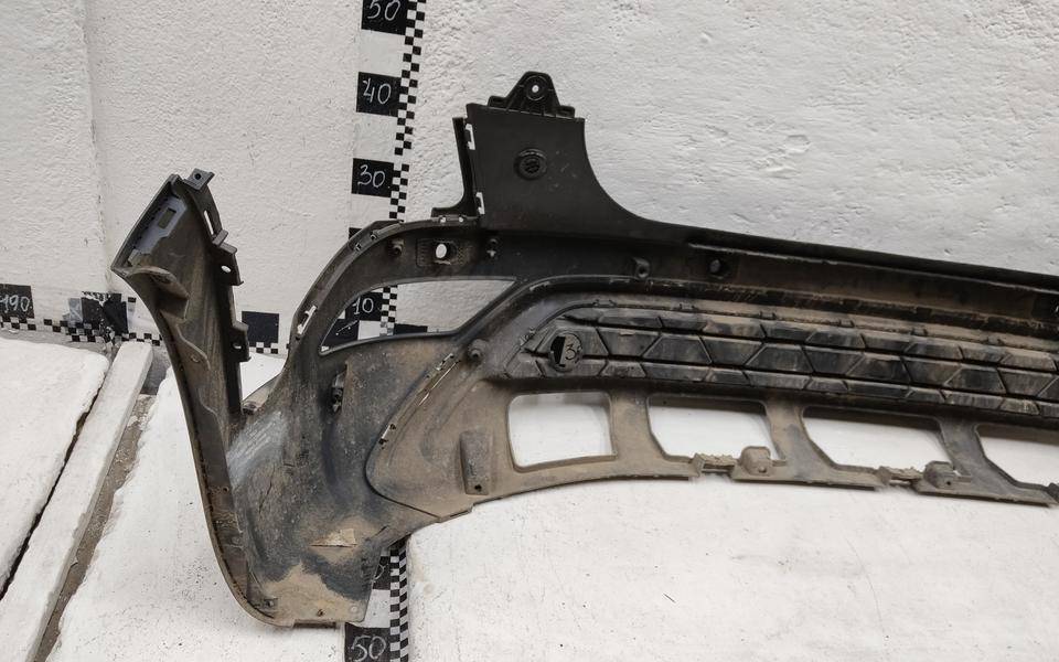 Состояние детали плохое. Серый цвет, потёртости, после частичного ремонта, в сборе с юбкой. Дефект боковых креплений бамперы и юбки с левой стороны, дефект крепления левой ПТФ, трещина с левой стороны в районе крепления решётки, запаяны трещины в средней части и с левой стороны. Ремонт трещины и креплений