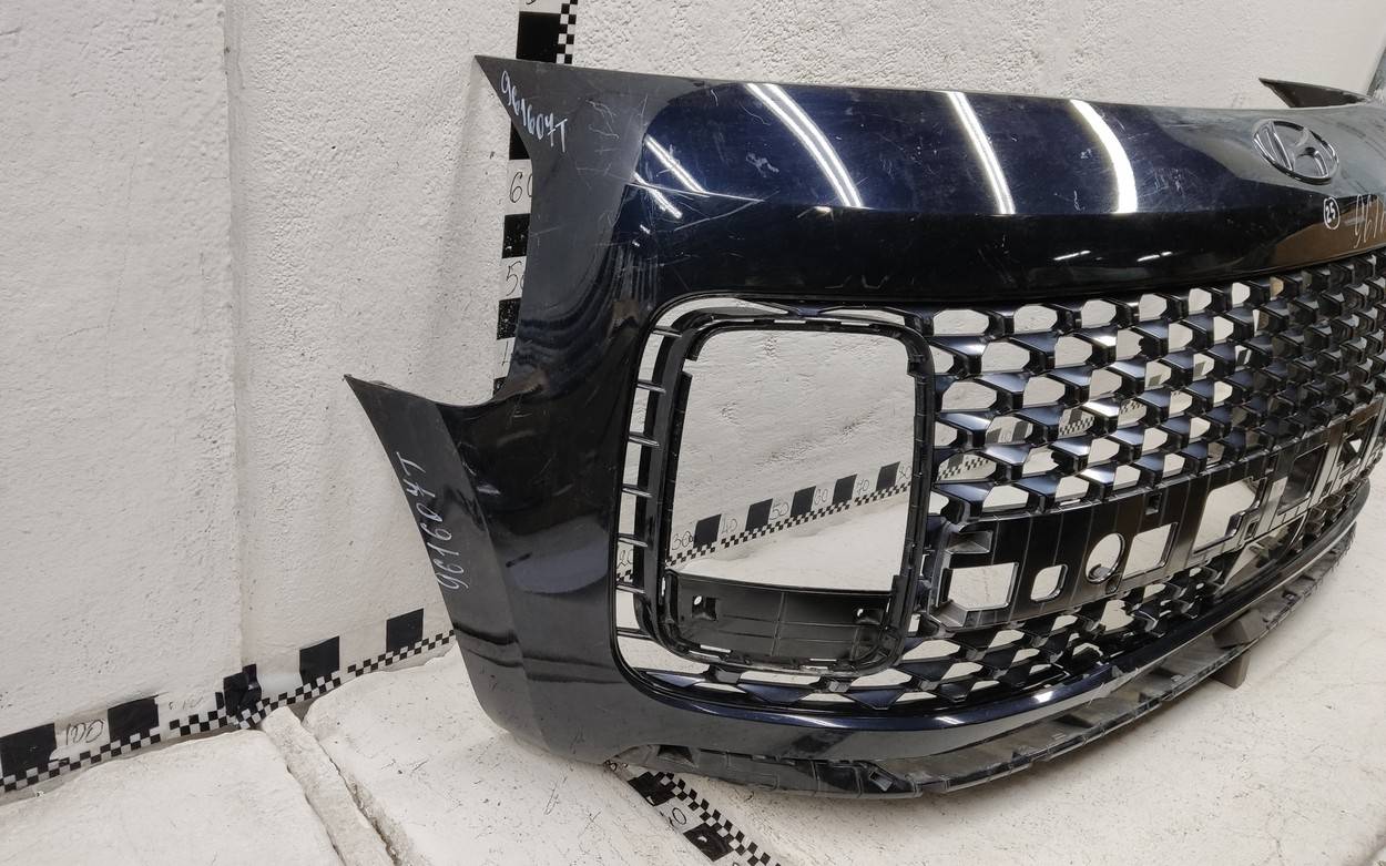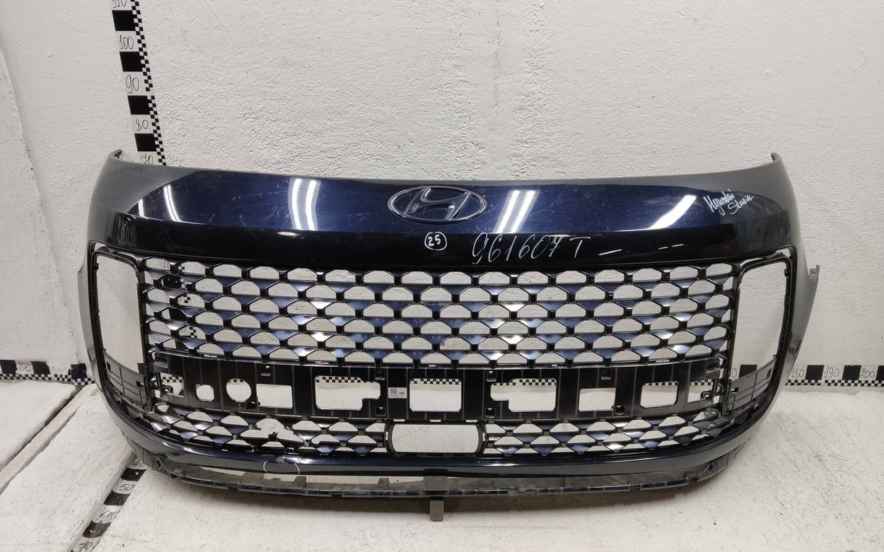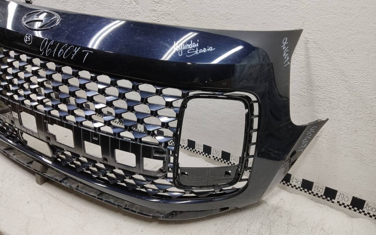 Состояние детали хорошее. Тёмно-синего цвета. Царапины, вмятинка. Скол пластика решетки. Отсутствует одно крепление. Потребуется незначительный ремонт Бампер передний для Hyundai Staria 2021>