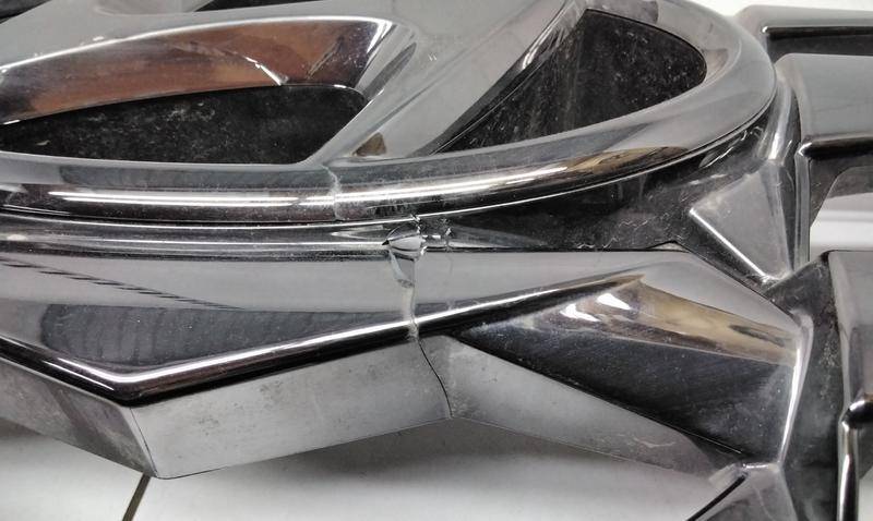Состояние детали удовлетворительное. Чёрный хром, со следами эксплуатации. Трещина на хроме под эмблемой, крепления целые. Потребуется ремонт