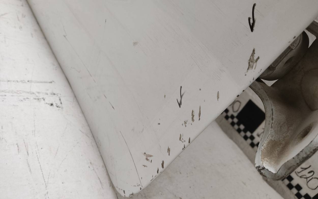 Состояние детали удовлетворительное. Белого цвета, скол ЛКП. Вмятины на внешней и внутренней поверхности. Потребуется ремонт