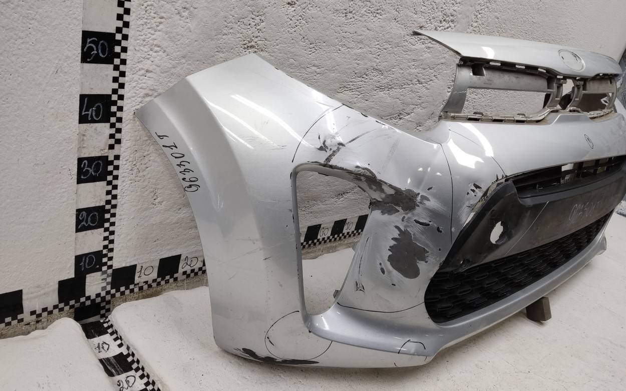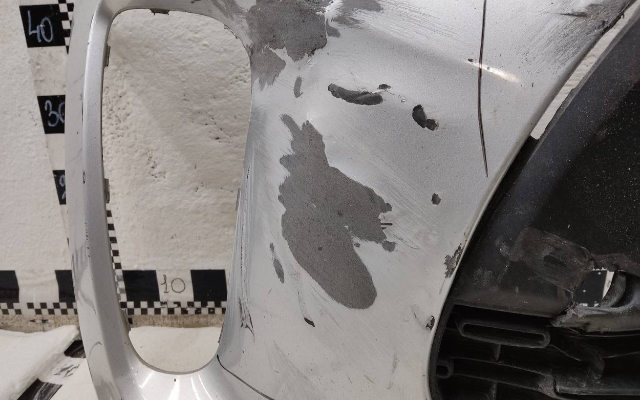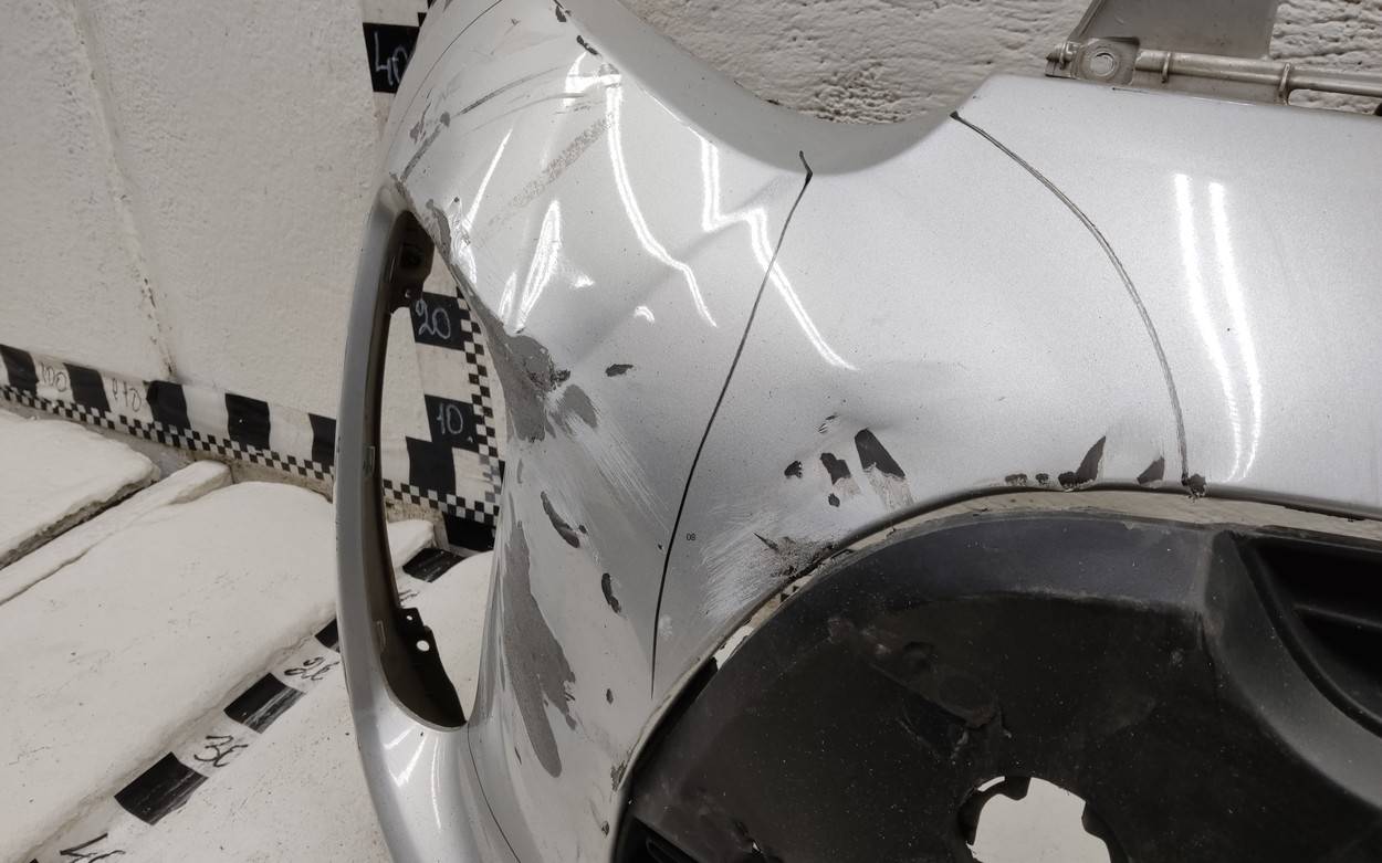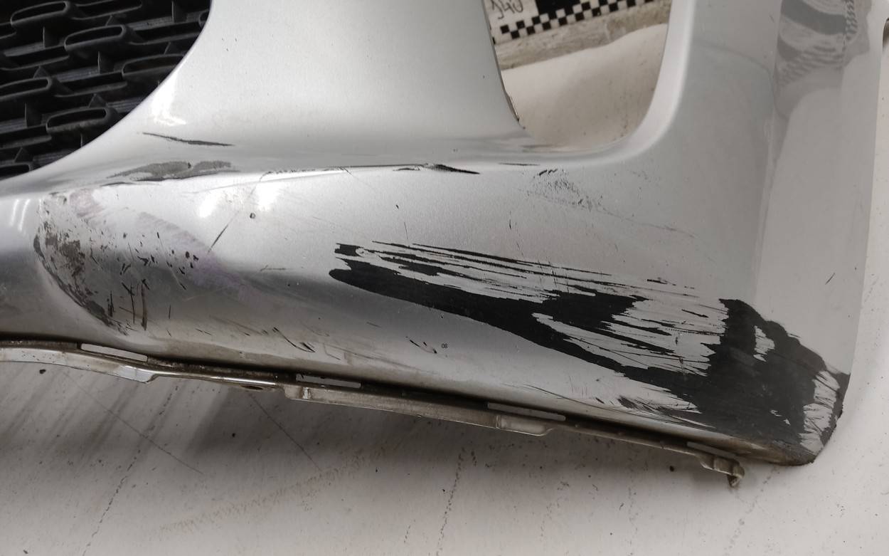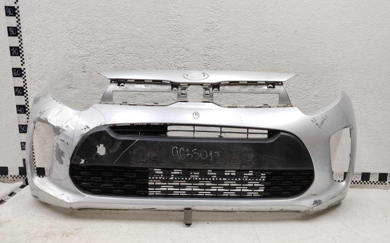 Состояние детали удовлетворительное. Серебристого цвета. После ремонта. Вмятины. Дефект пластика решетки на фото. Сломано два верхних боковых крепления, отсутствуют два под правую ПТФ. Потребуется дополнительный ремонт Бампер передний для Kia Picanto (JA) 2017>
