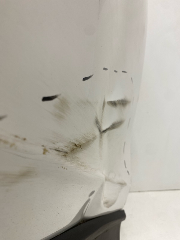 Состояние детали удовлетворительное. Следы эксплуатации , цвет серый, бампер вместе с решёткой радиатора и юбкой. Царапины и потёртости, разрыв бампера в левой верхней части, разбиты решётка радиатора в центральный левой части, трещина на юбке в центральной левой части, небольшая трещина на бампере в левой нижней части, повреждены крепления юбки и бампера в левой нижней части, две трещины на кронштейне крепления крыла слева. Потребуется ремонт