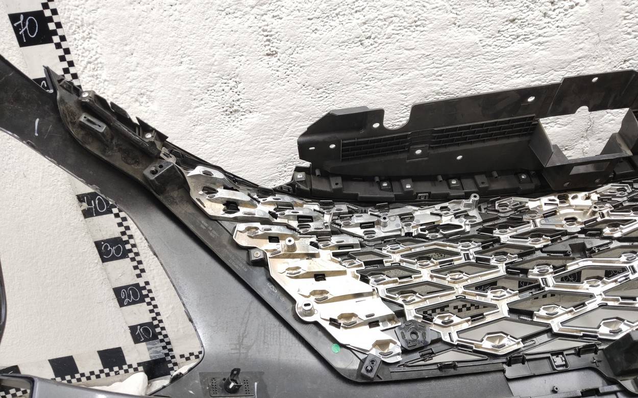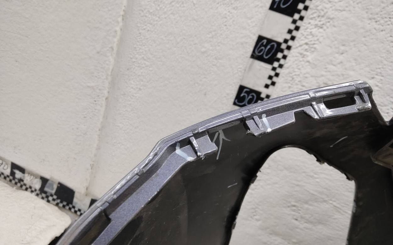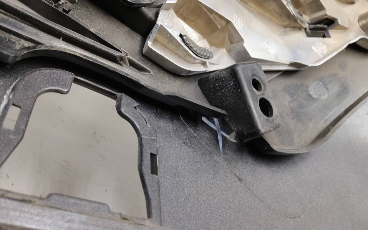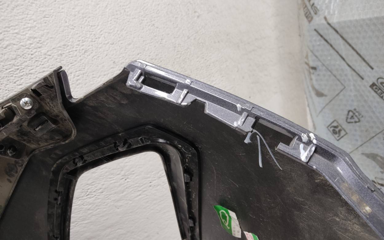 Состояние детали хорошее. Серого цвета под парктроники. Царапины. Отсутствуют два верхних боковых крепления и одно центральное под решетку. Потребуется незначительный ремонт