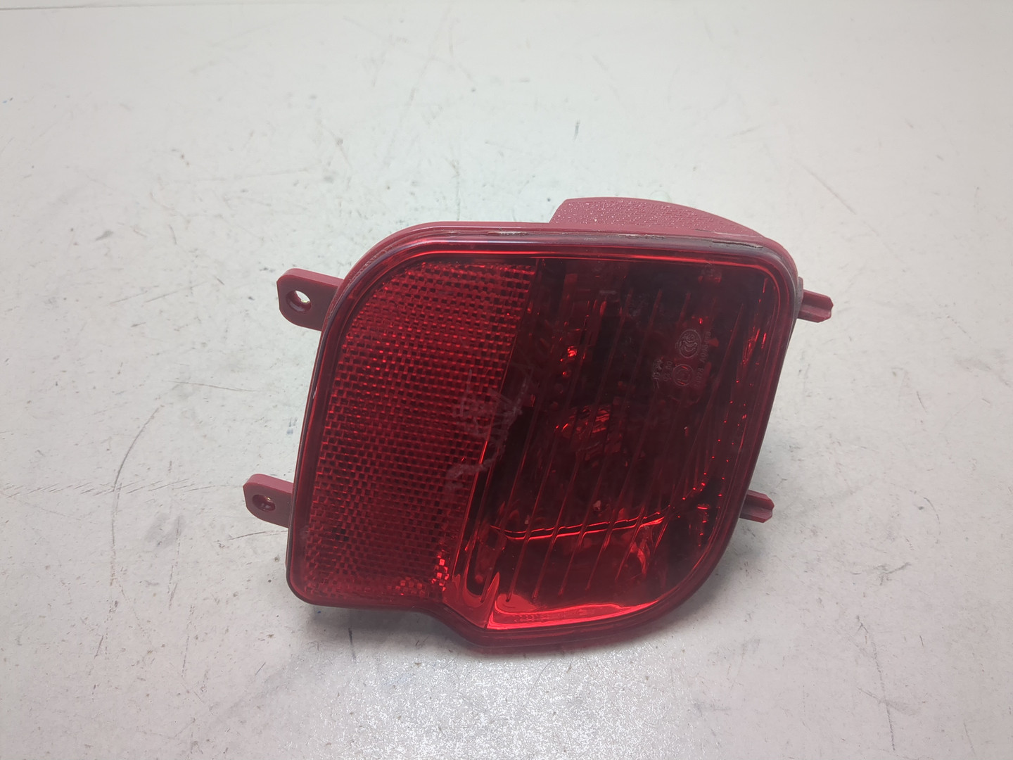 Состояние детали хорошее. Красного цвета, потёртости, царапины. Притёртость и трещина пластика с левой стороны, дефект крепления слева. Потребуется ремонт и покраска