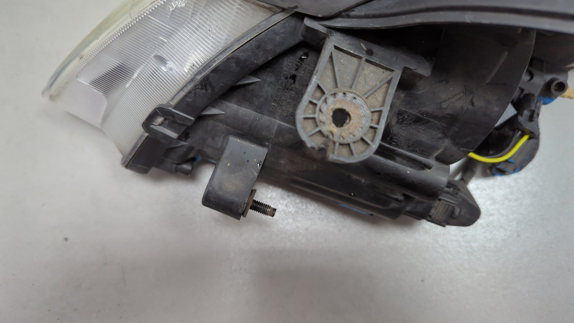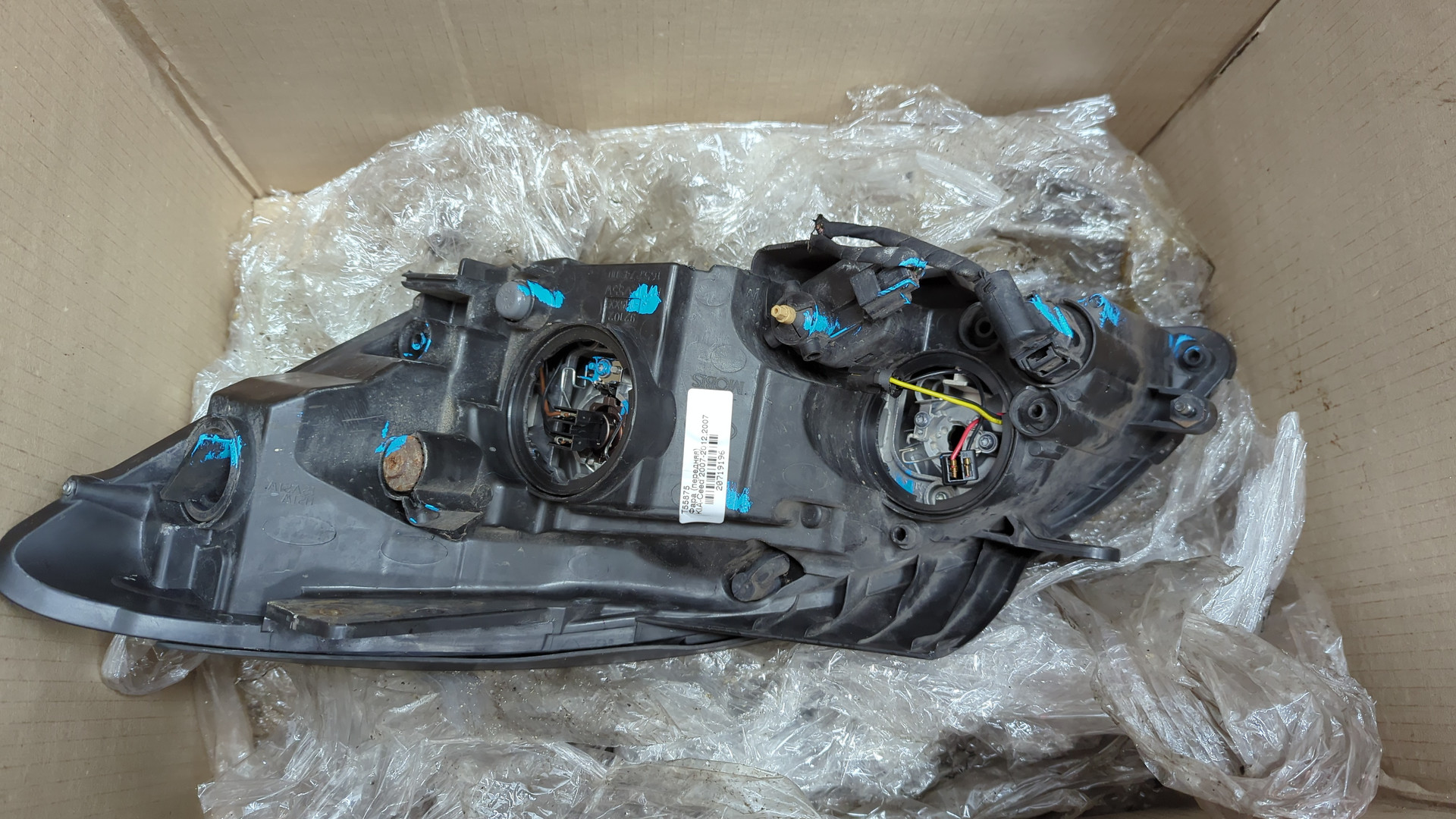 Состояние детали удовлетворительное. Дефект на стекле вмятинка, внутреннее повреждение фары в месте вмятинки. Корпус и крепления целые. Потребуется ремонт