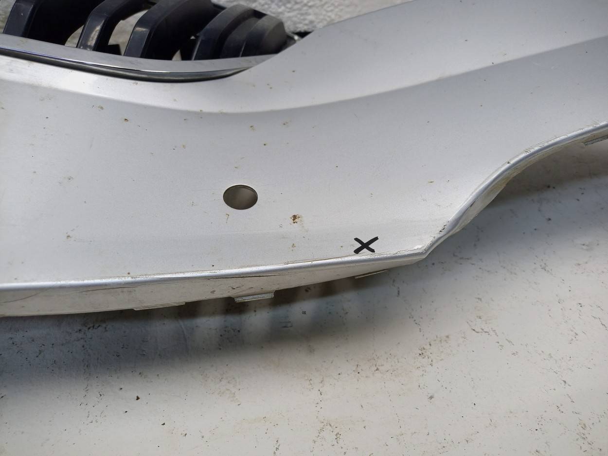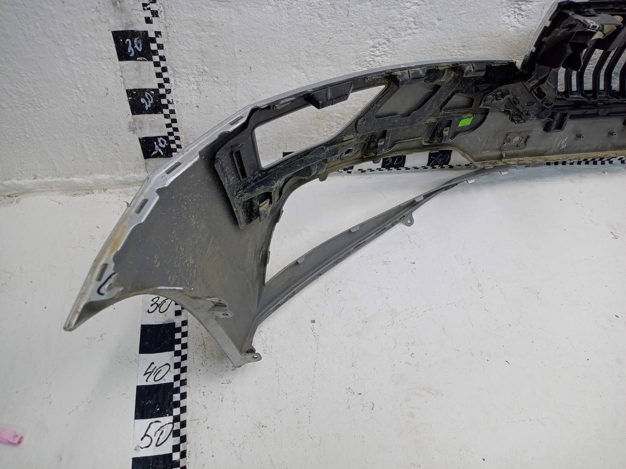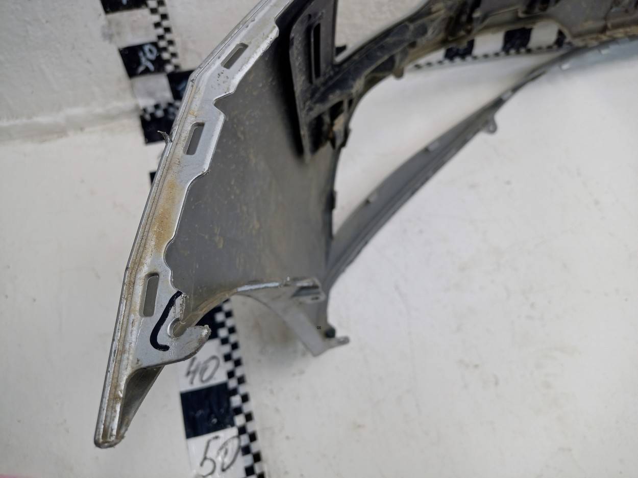 Состояние детали удовлетворительное. Серого цвета, потёртости, в сборе с юбкой. Небольшая деформация, дефект креплений на бампере с правой стороны, трещинка на креплении слева, трещинка справа, где решётка радиатора. Потребуется ремонт и покраска