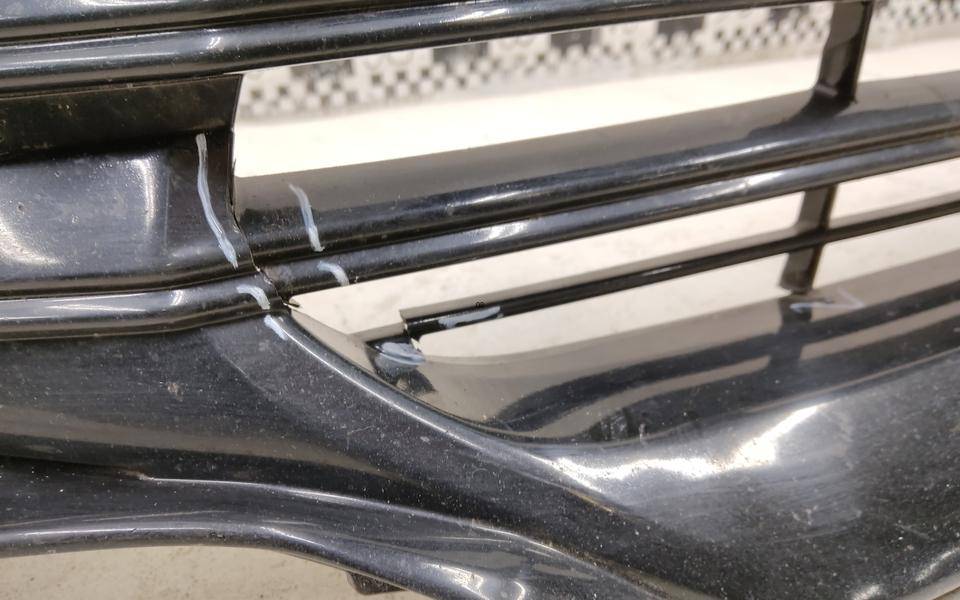 Состояние детали хорошее. Чёрного цвета, потёртости, царапины. Трещина пластика в нижней части снизу слева, трещина на креплении решётки бампера по центру сверху, основные крепления целые. Потребуется ремонт и покраска