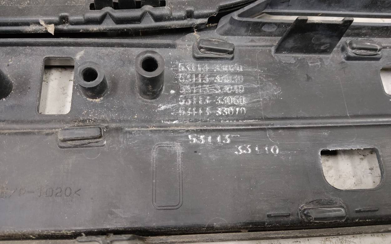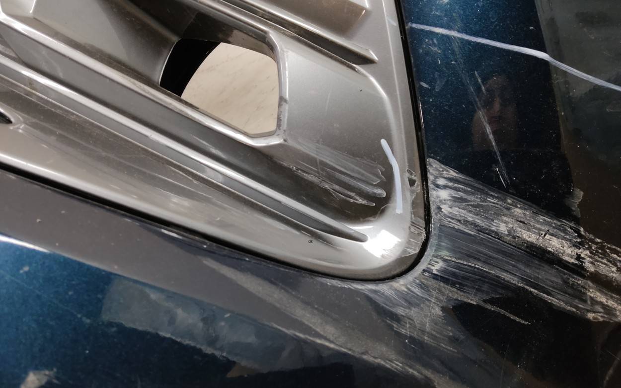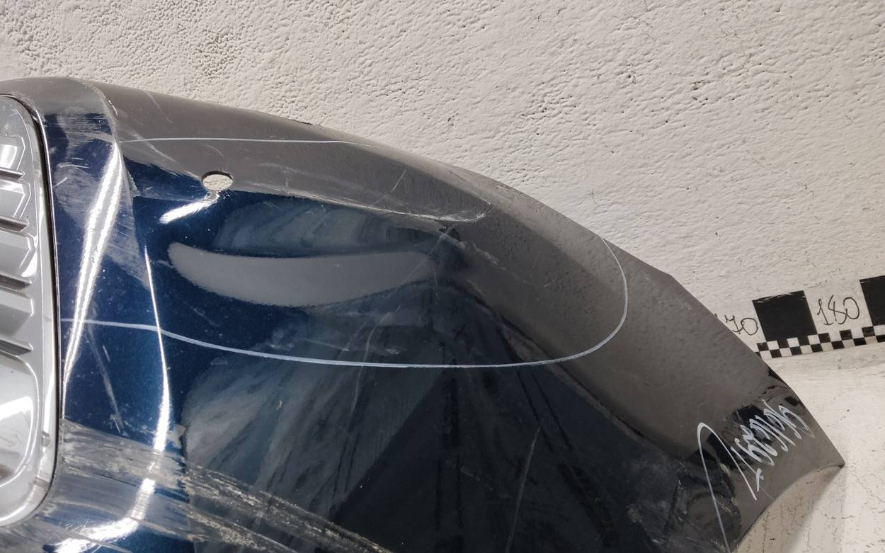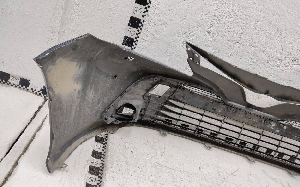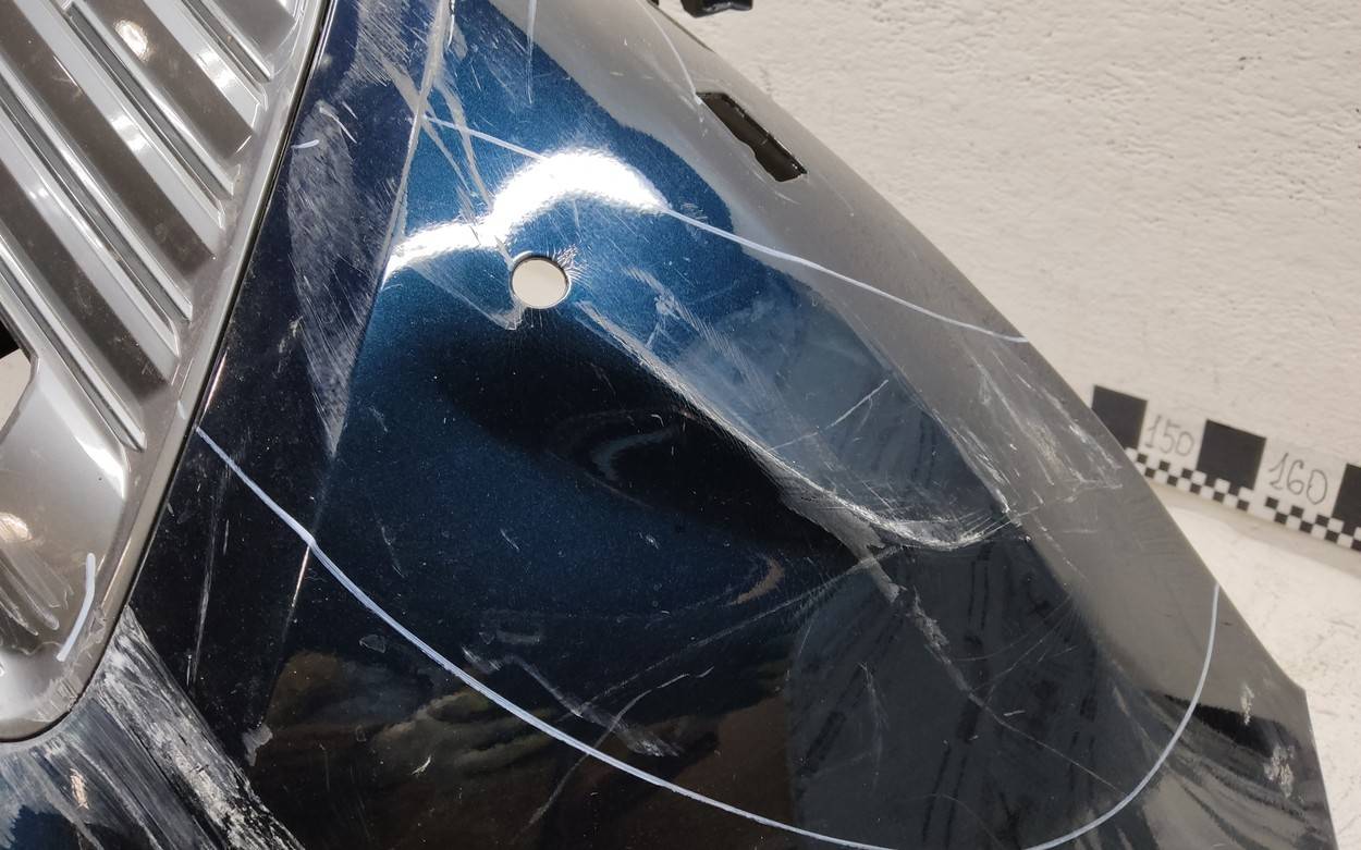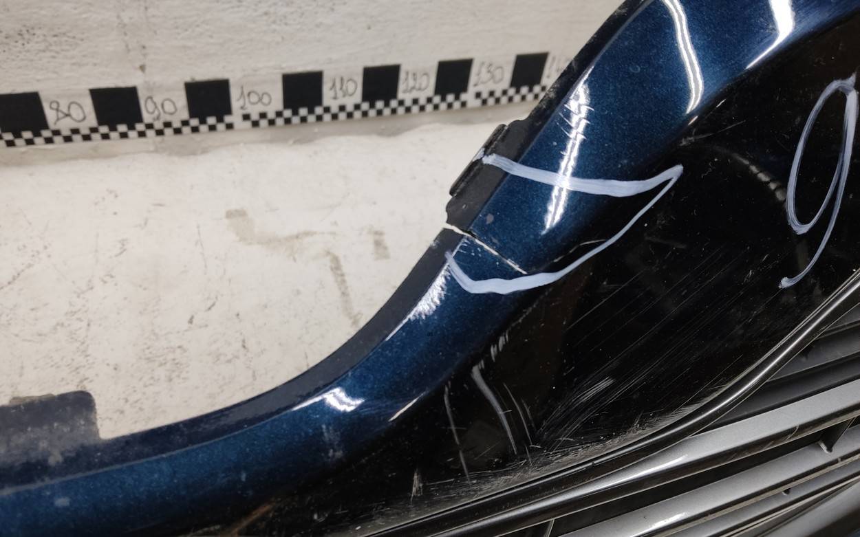 Состояние детали удовлетворительное. Тёмно-синего цвета под парктроники и омыватели фар. Вмятины, трещина. Решетка с царапинами. Лопнуло одно крепление. Потребуется ремонт