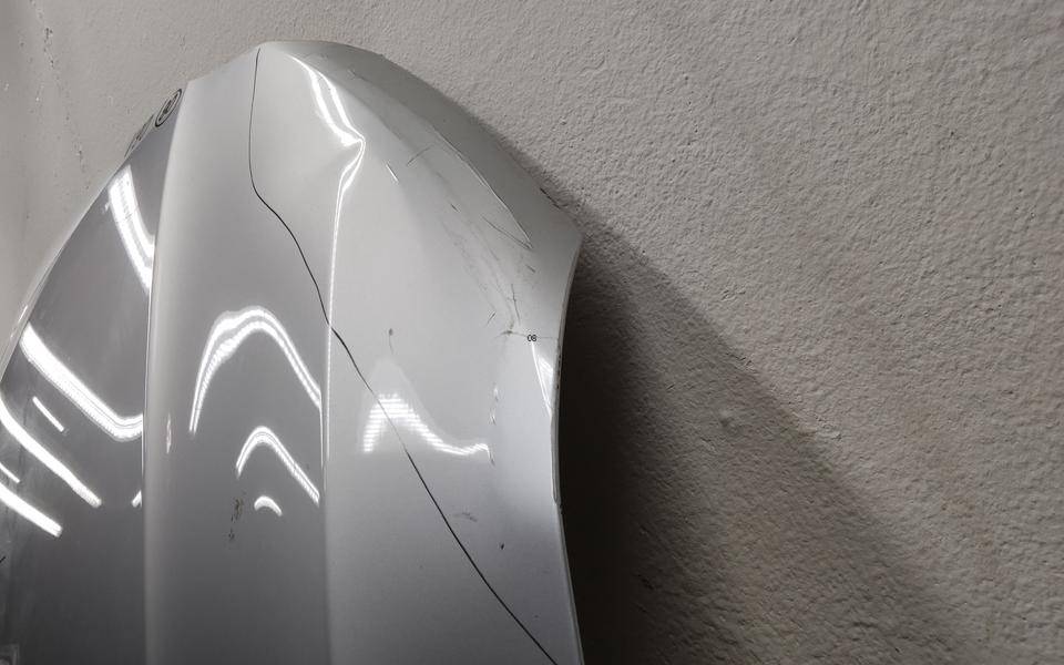 Состояние детали хорошее. Серого цвета, небольшая трещина по кромке проема под правую фару, вмятина. Накладка с царапинами. Дефект одного крепления. Потребуется ремонт